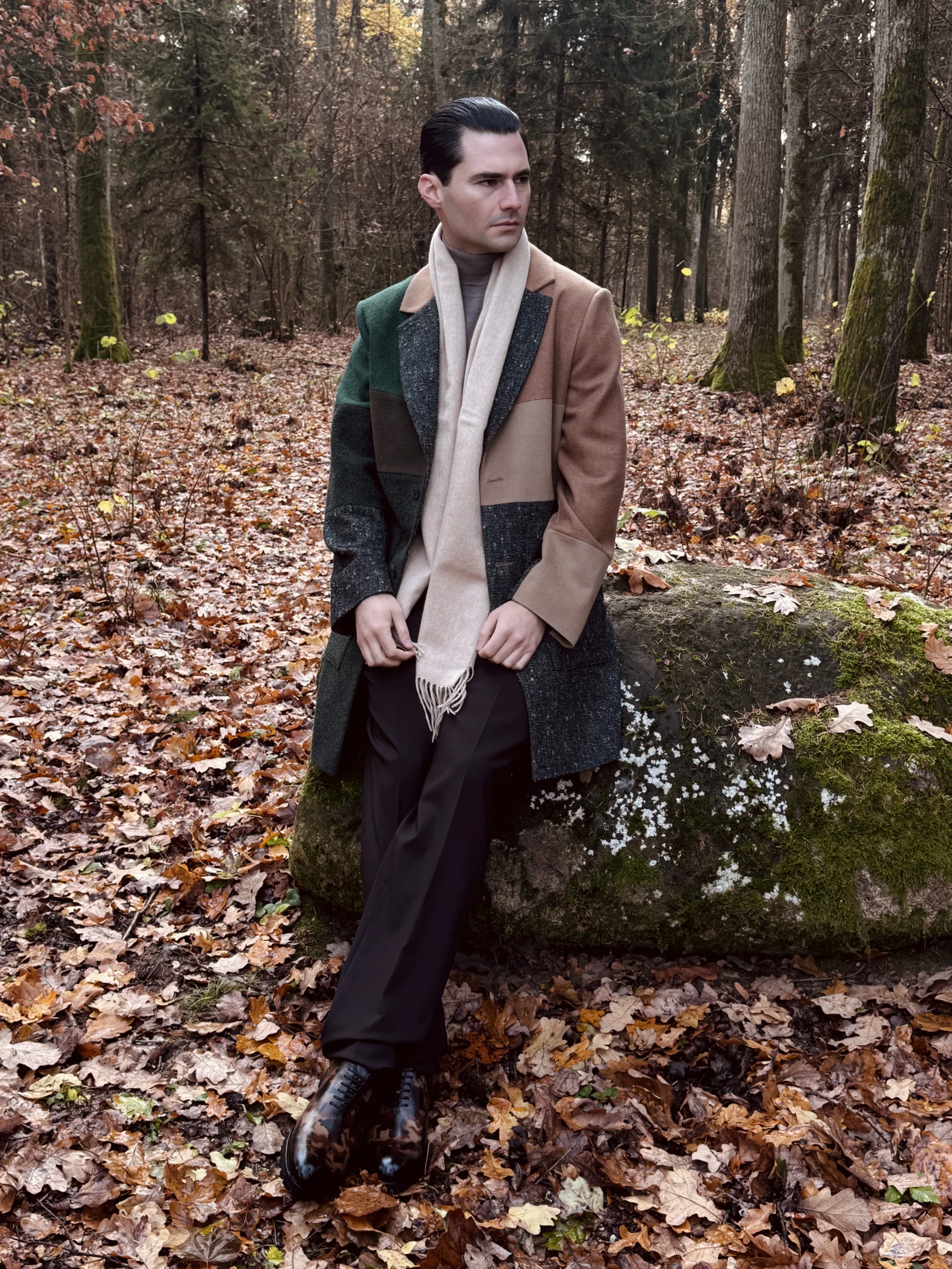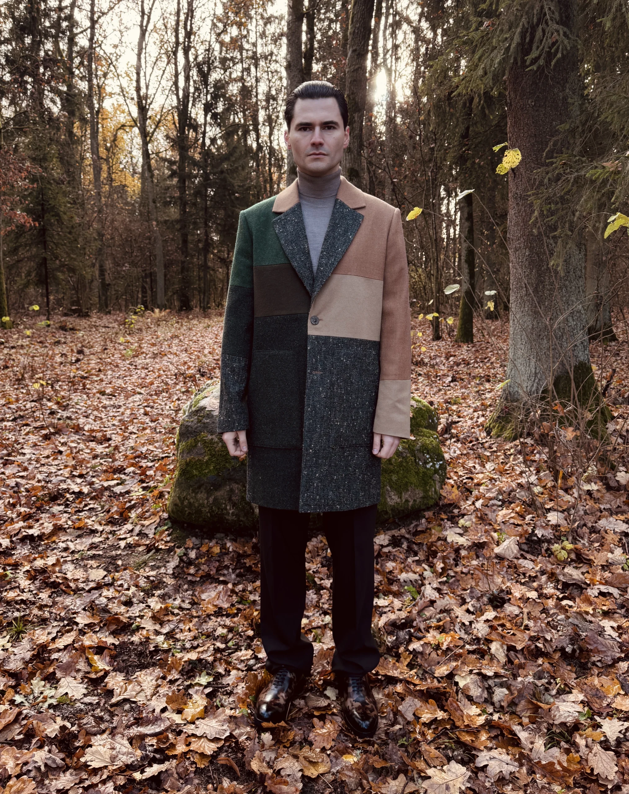 Žemės spalvų vyriškas paltas išsiskiria unikaliu spalvų deriniu – žalių, rudų ir smėlio atspalvių kombinacijos subtiliai įsilieja į skirtingų vilnos tekstūrų visumą. Laisvas kirpimas užtikrina judėjimo laisvę ir maksimalų patogumą, todėl paltas idealiai tinka aktyviam ir stilingam vyrui. Minimalistinė apykaklė ir ilgesnis kirpimas pabrėžia eleganciją, o uždėtinės kišenės suteikia praktiškumo ir šiuolaikiško žavesio. Tai drabužis, kuris vienu metu derina tradiciją ir modernumą, išlaikydamas išskirtinę estetiką.